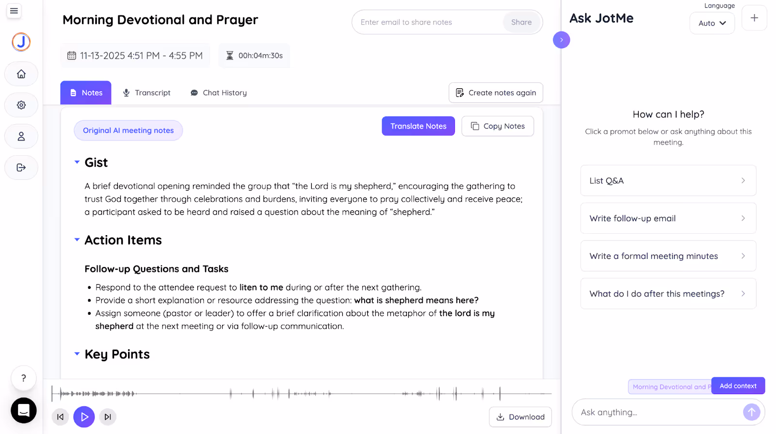After your worship service, JotMe automatically generates clear AI notes and summaries that highlight key points and action items. This makes it easy for church members to review the message or catch up if they missed anything during the live event. These summaries are easy to share with members so they can go through them quickly and understand.