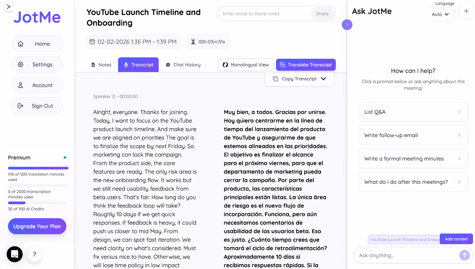 After every meeting, JotMe generates a complete post-meeting transcript that serves as a reliable reference for everything discussed. The transcript is available in both monolingual and bilingual views, allowing you to review the conversation in the original language or side-by-side with a translated version.