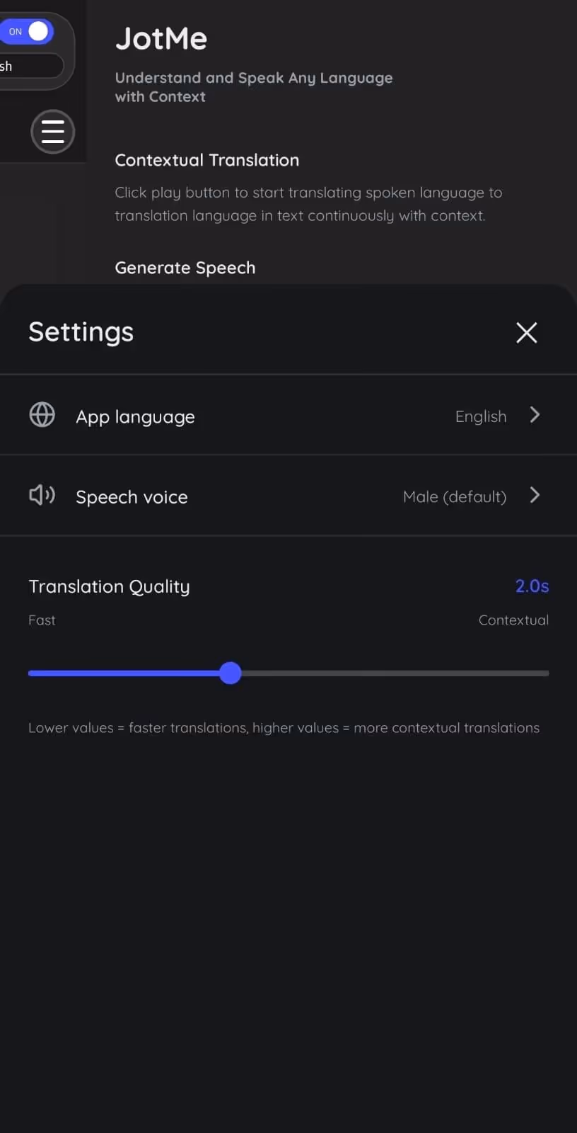 In addition to the continuous translation feature, the JotMe mobile app offers live contextual translation, speech generation, and translation quality settings.