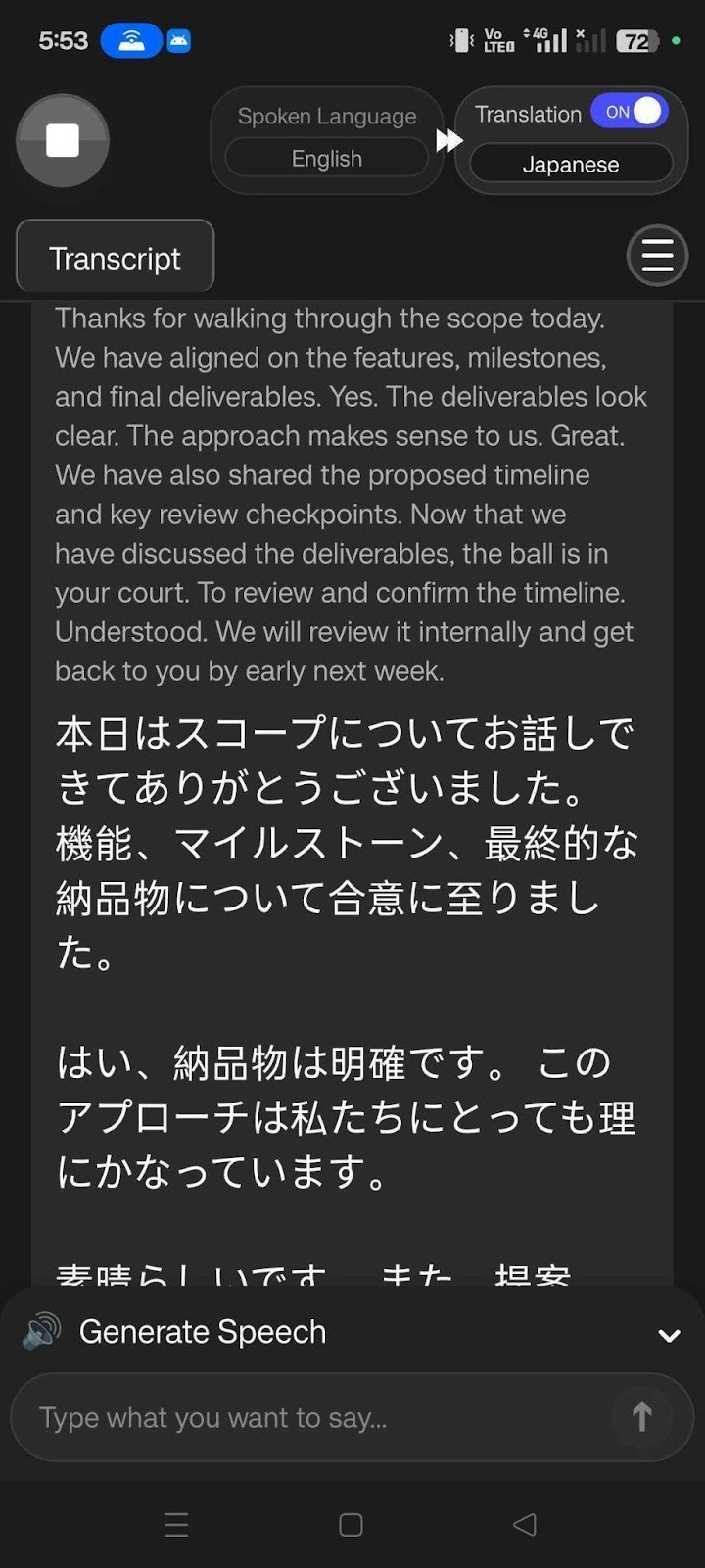 Live Contextual Translation: JotMe’s mobile app doesn’t just translate words; it also understands the intent, emotions, and meaning behind them. Last month, during a meeting with Japanese-speaking clients, someone said, “Now that we have discussed the deliverables, the ball is in your court to review and confirm the timeline.” JotMe translated it as: