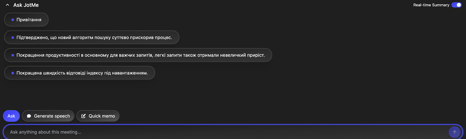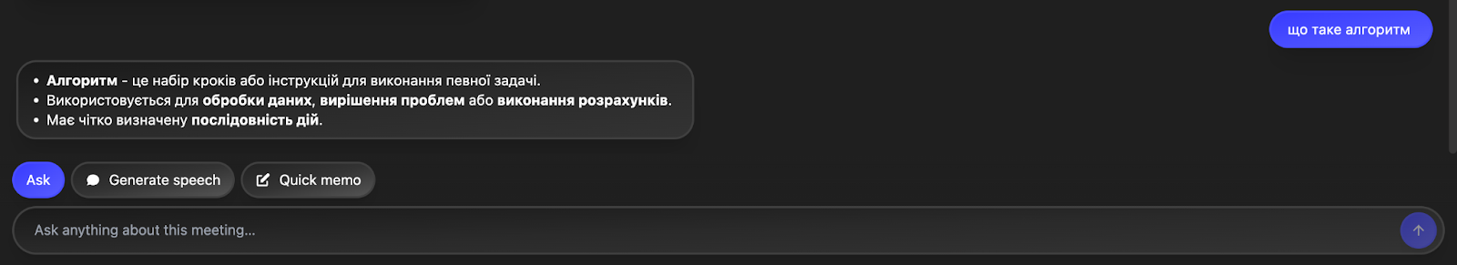 Whenever we had a meeting with Ukrainian-speaking software developers, technical terms like algorithms, data structures, source code, and more came flying in from all directions. In such cases, JotMe’s AI Ask feature is a huge help. We can use it to clarify points or get definitions of terms, without interrupting the conversation flow. For example, during a project update, someone asked “що таке алгоритм (what is algorithm), and JotMe clearly explained that it’s a finite set of instructions designed to solve a specific computational problem.