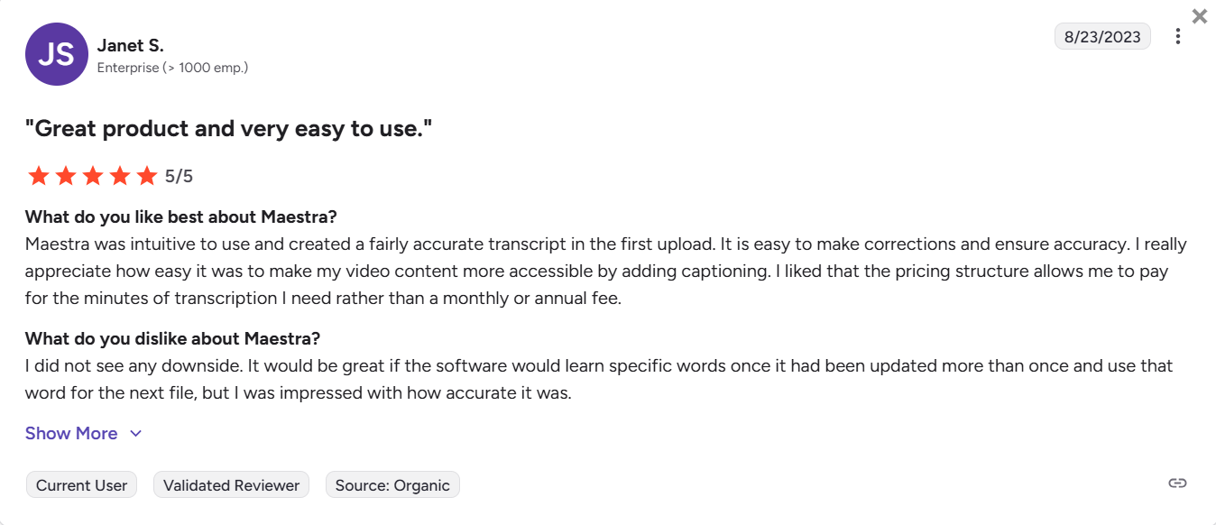 A user on G2 reported that Maestra would learn specific words after being updated multiple times, for higher accuracy.