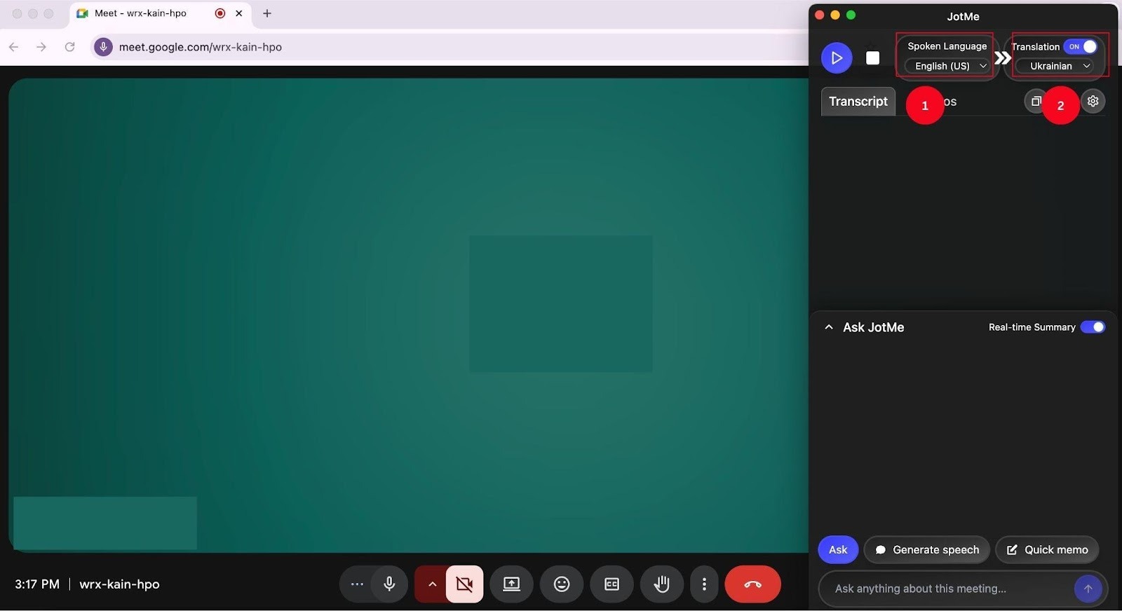 Open the video conferencing platform and start your meeting. Then, launch JotMe and set the “Spoken Language” to English and “Translation Language” to Ukrainian. Keep the JotMe window open to detect the ongoing conversation for translation.