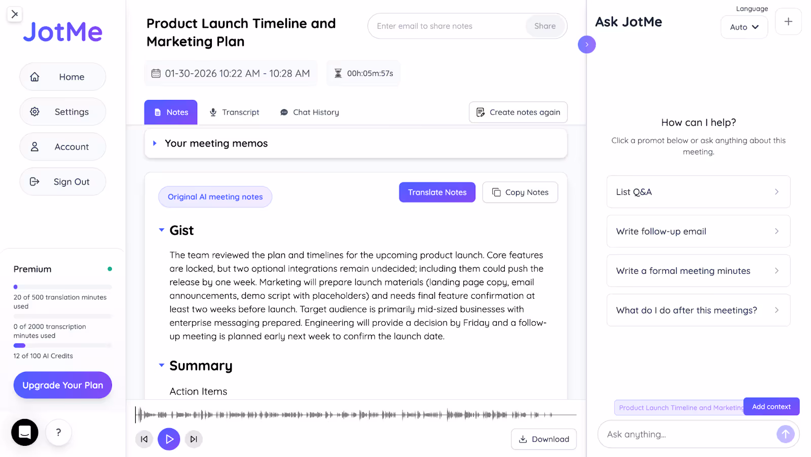 During our testing to understand the AI live translation capabilities of JotMe, we also found how it helps organize the meetings after they are concluded. With its AI Meeting Notes Translator, JotMe converts spoken conversations and transcribed content into context-aware, multilingual summaries. This means you don’t just get a word dump, but clear, structured meeting notes with action items, jargon clarification, and relevant highlights.