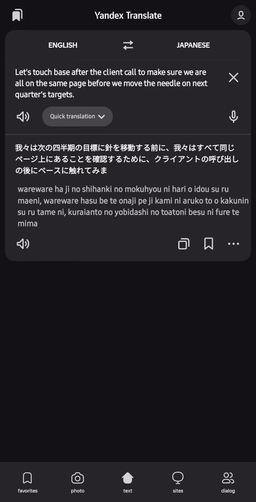 So, when someone said, “Let’s touch base after the client call to make sure we’re all on the same page before we move the needle on next quarter’s targets,” Yandex Translate translates as: