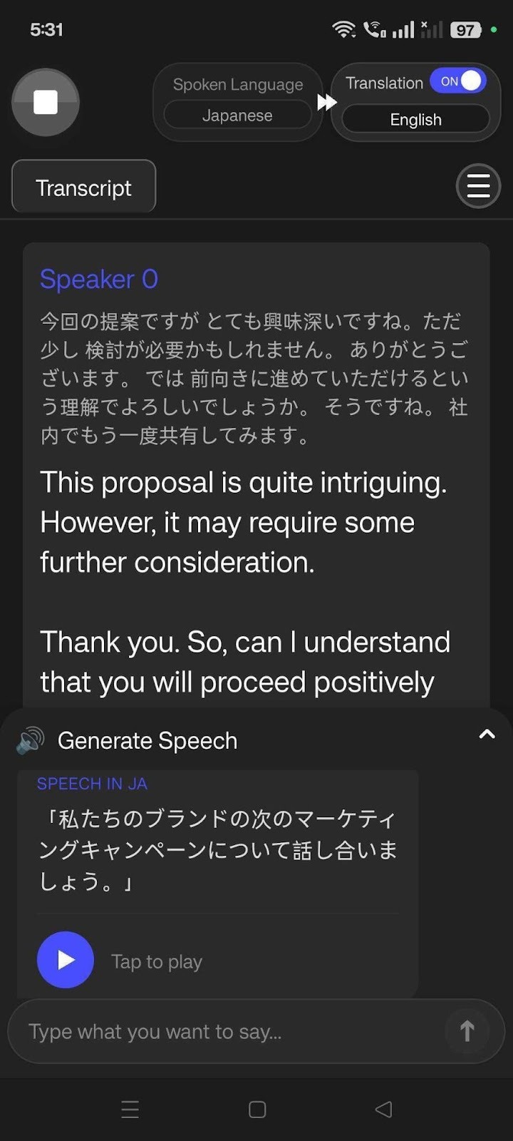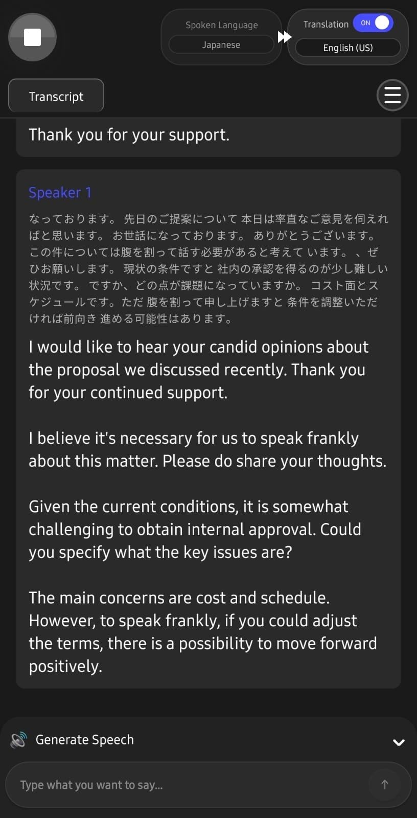 The speech generation feature on the JotMe mobile app helped me a lot when speaking with my Japanese-speaking colleagues. I could explain a concept in detail, and everyone understood well.
