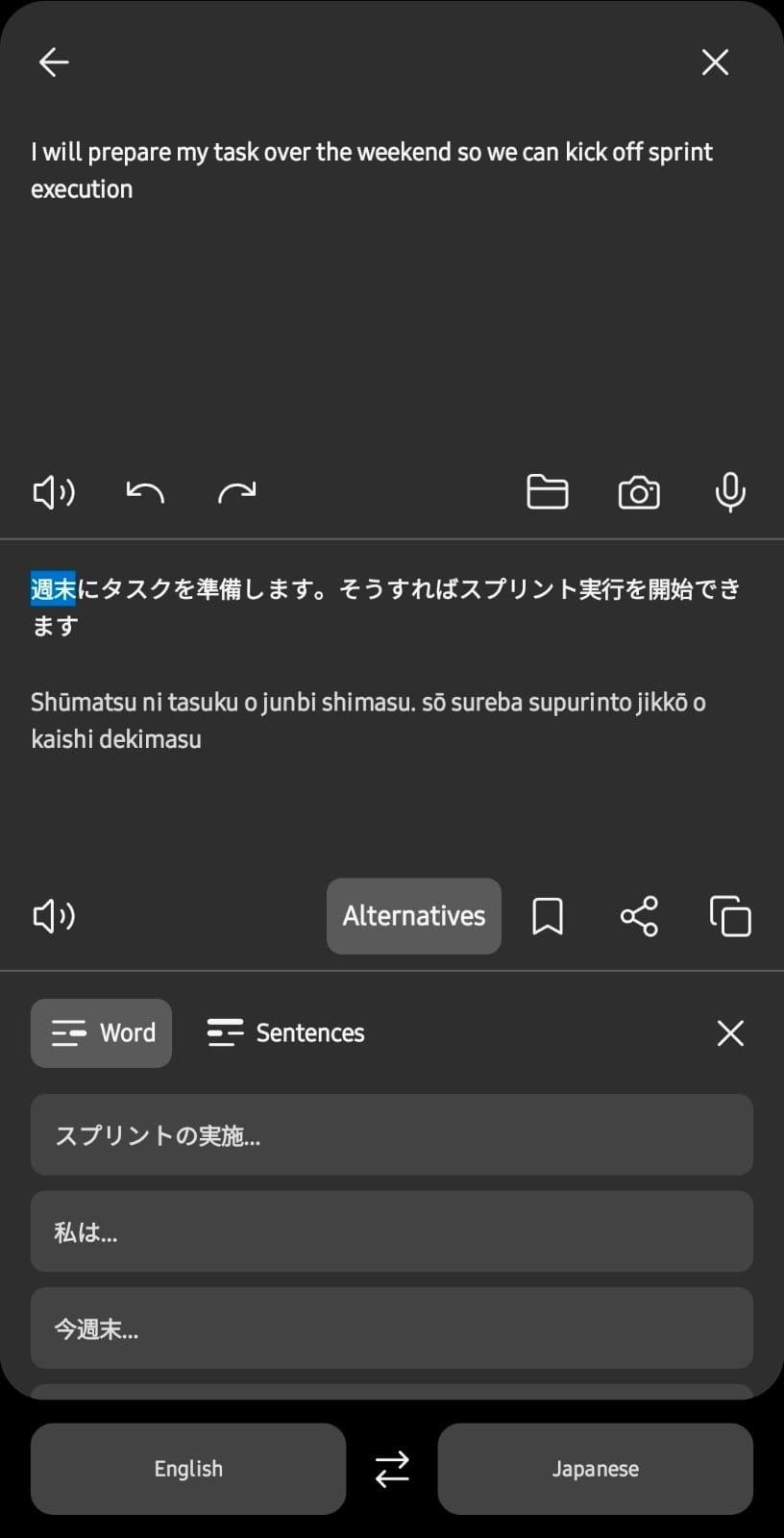 The translations were quick and accurate, as the translation of “I’ll prepare my tasks over the weekend so we can kick off sprint execution” came out as:
