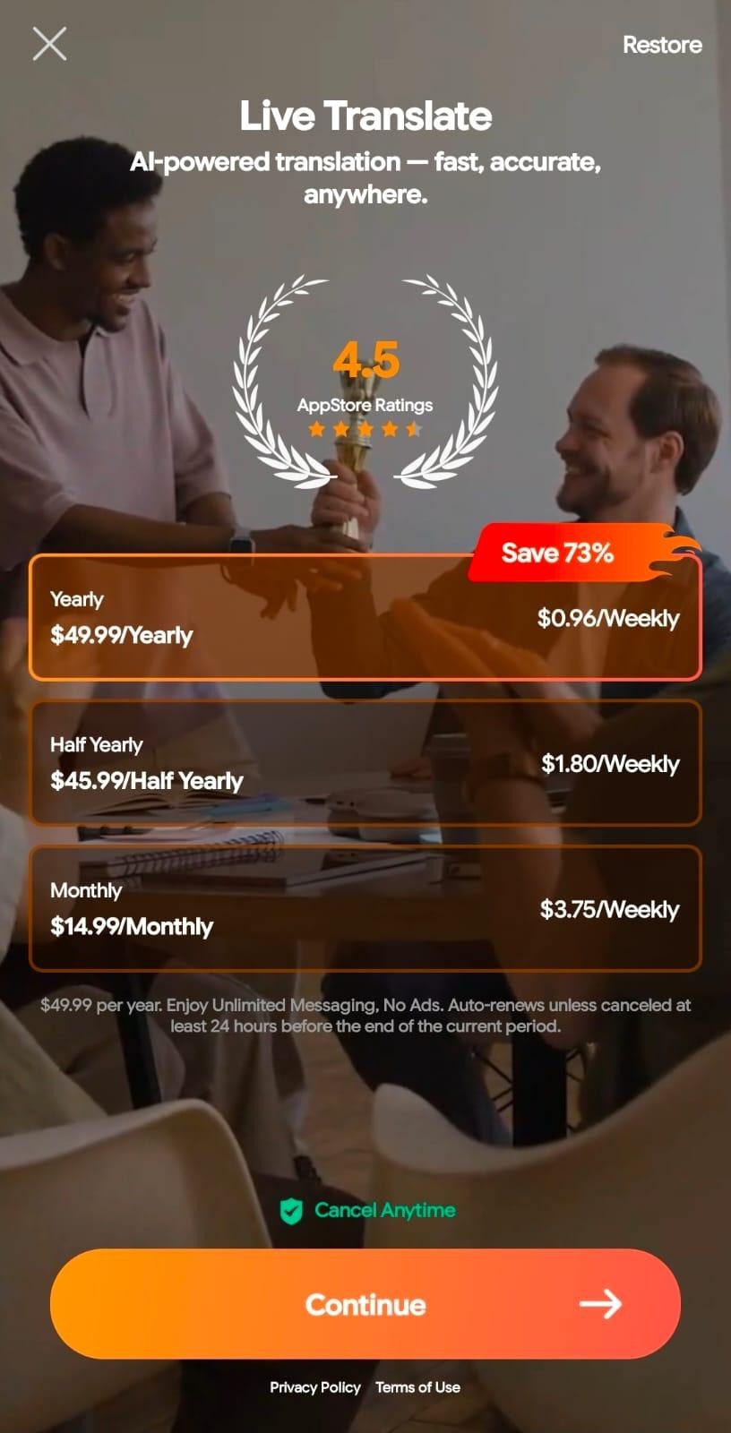 Live Translator: AI translate offers a free trial for basic translations, and its Premium plan is billed monthly, half-yearly, or annually.