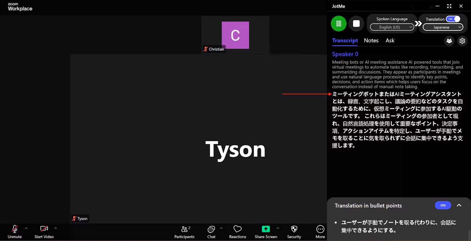 Yes, JotMe can translate multiple speakers at once without needing an AI assistant to join the meeting. To do this, you simply need to set the “Spoken Language” in the JotMe window to Multilingual. JotMe will automatically detect the spoken languages and provide real-time translation in your preferred language, without appearing as a participant in the meeting.