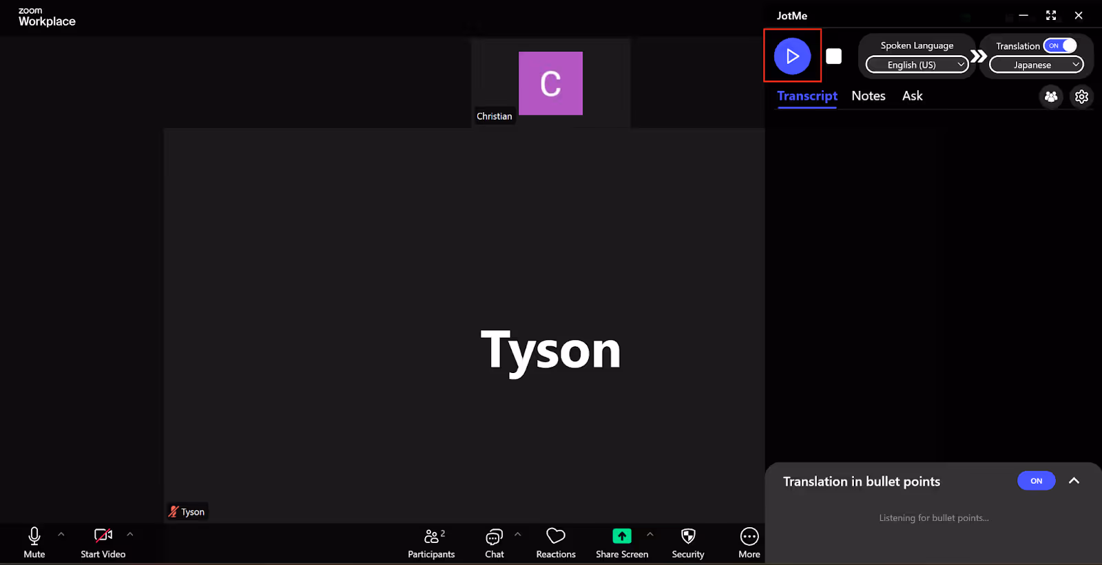 Now that you’ve selected the languages, simply click on the “Play” button on the top-left of the JotMe window to begin the bot-less live translation.