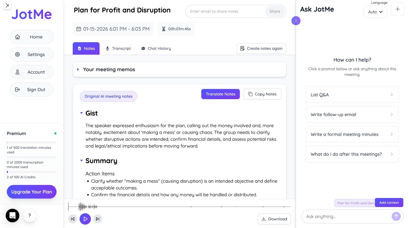 Corporate Communication: Live AI subtitle translators can also be handy for enterprises that onboard people from other countries. Rather than recording training videos in a new language, they can keep live translators like JotMe open, which provide instant, contextually accurate translation. Not only that, as the video ends, JotMe shares concise meeting notes, divided into Summary, Gist, and Action Items. You can ask JotMe to draft an email and send it to your trainees for reference.