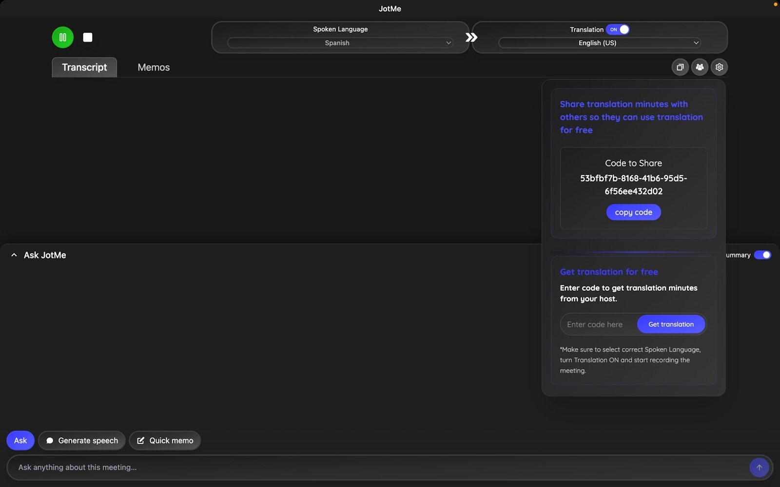 Moreover, if a streamer from another country wants to join the broadcast, JotMe’s shareable translation minutes feature is helpful. You can share the code so they can access the translation and understand what you say, at no cost.