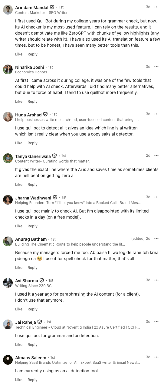 Along with the poll, around 10 respondents (about 44%) left comments explaining how they use QuillBot and which features they find useful.