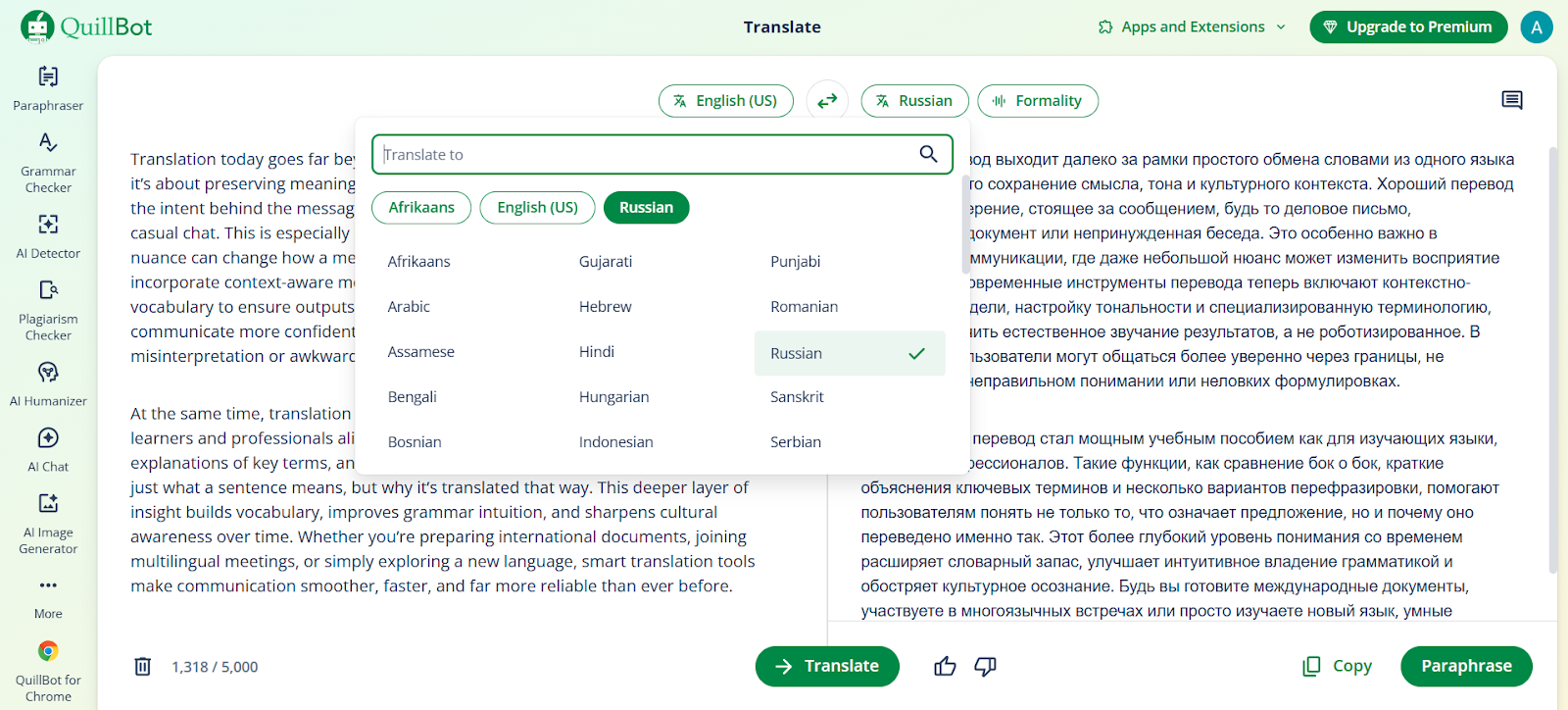QuillBot is better known as a paraphraser and rewriting tool for academics and students, with an added AI translation feature. The text translation tool is said to be accurate, so we used QuillBot to perform English to Russian translation of notes, and the results turned out fine.