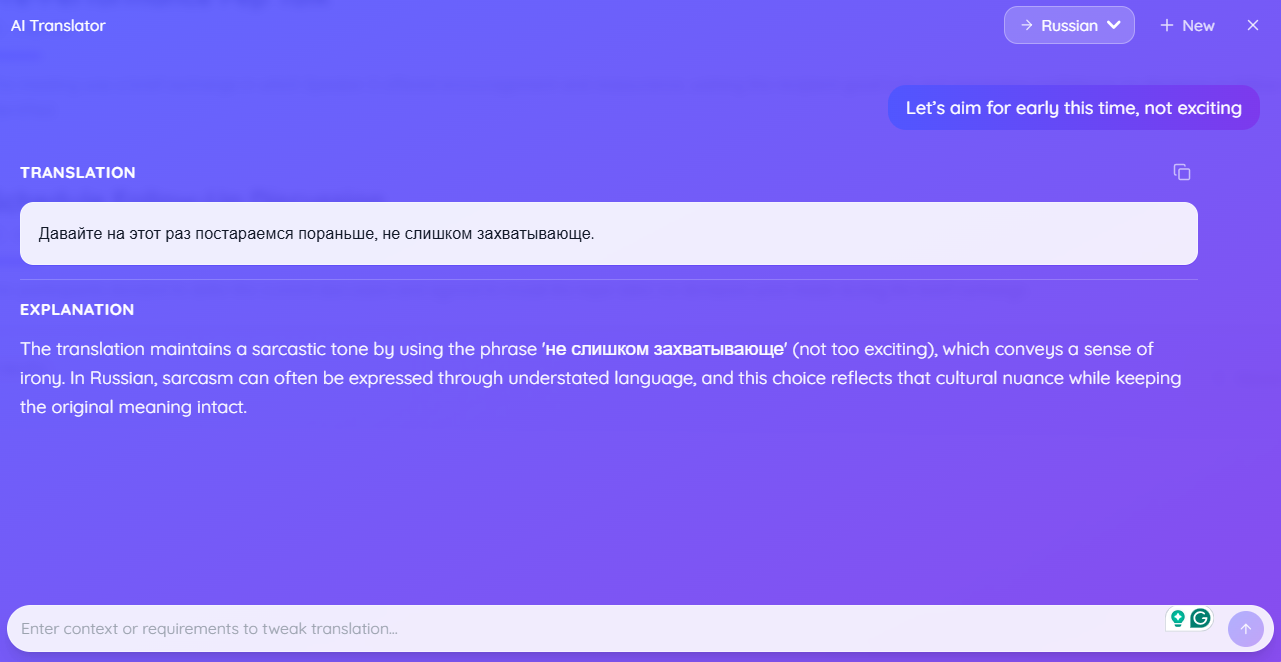 If you’re someone trying to be proficient in Russian or any other language, JotMe can be your reliable AI interpreter. Alongside accurate text translations, JotMe provides a short, easy-to-read explanation of the intent, meaning, and context of key terms.