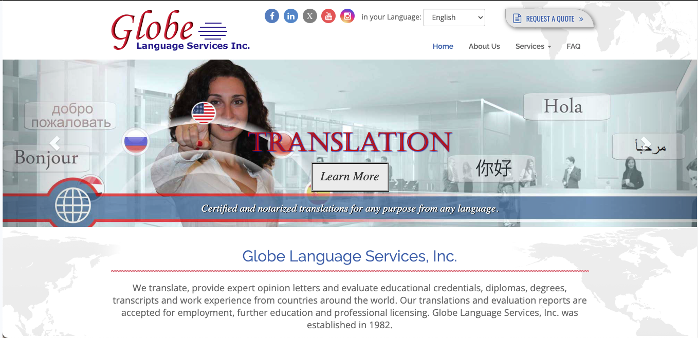 Globe Language Services is an enterprise translation agency serving legal firms, financial institutions, hospitals, and academic credential evaluation services requiring certified translation, notarization support, and compliance guarantees for regulated document types.