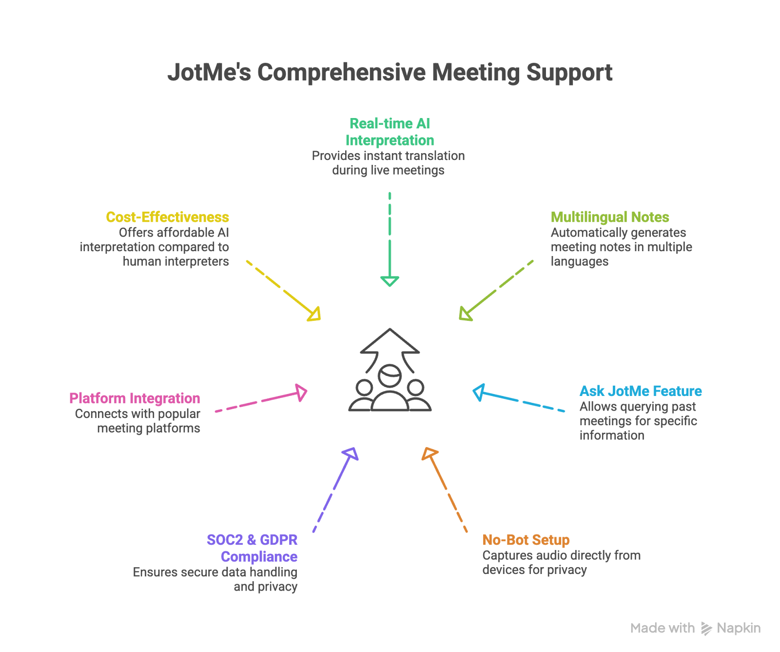 Try JotMe for your next multilingual meeting and experience how real-time interpretation eliminates post-meeting translation cleanup, generates automatic multilingual notes, and provides searchable meeting archives for retrieving past decisions. Sign up today and start using secure AI translation to communicate across languages with 24/7 interpreting for real-time conversations between global teams.