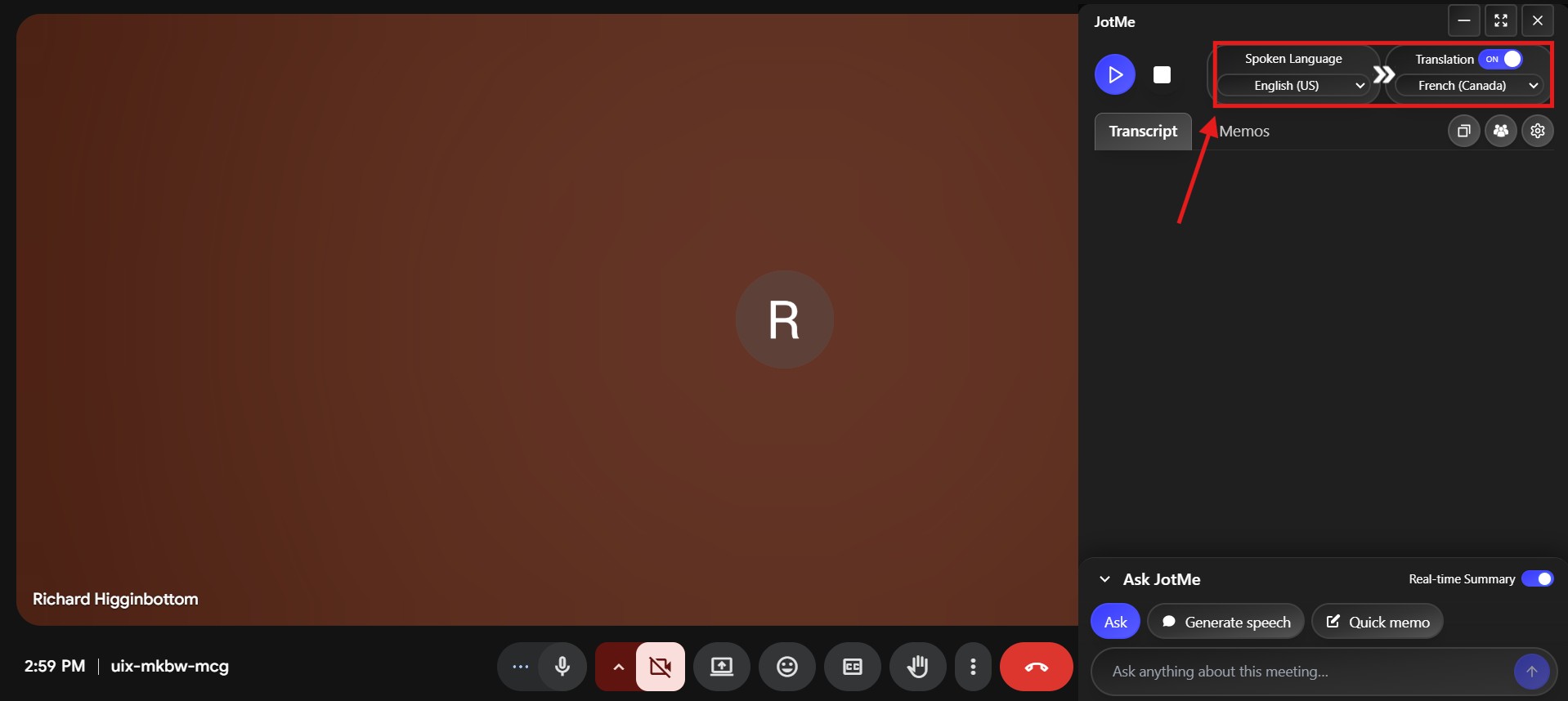 As your colleagues join the call, launch JotMe on your desktop and toggle the Translation option if turned off. Then, set “Spoken language” to English and “Translation Language” to French Canadian.