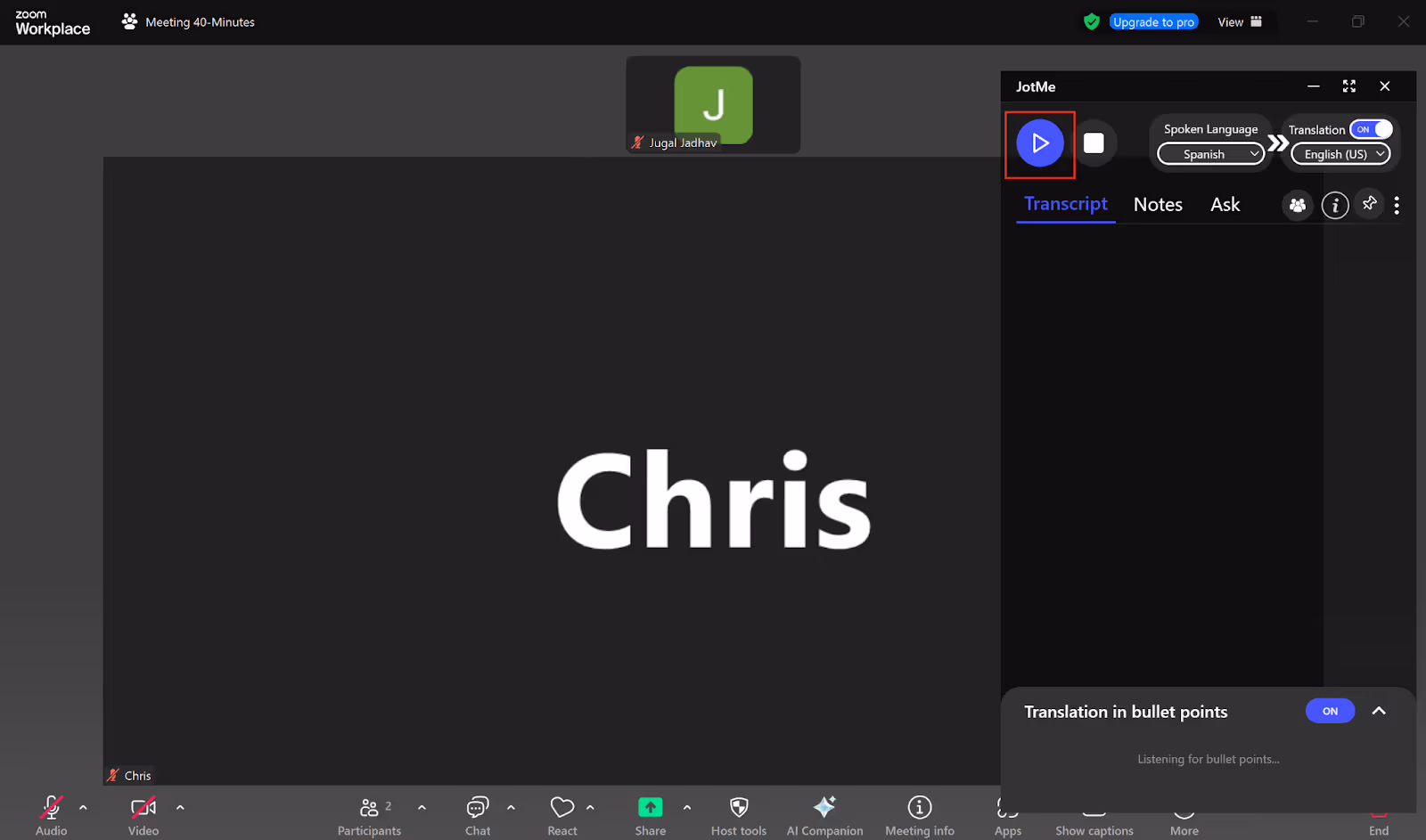 JotMe lets you effectively translate your Zoom meetings from one language to another in real time. JotMe also allows you to share the translation minutes with other participants, access post-meeting notes, and get translation in bullet points. Let’s get into the details of these features.