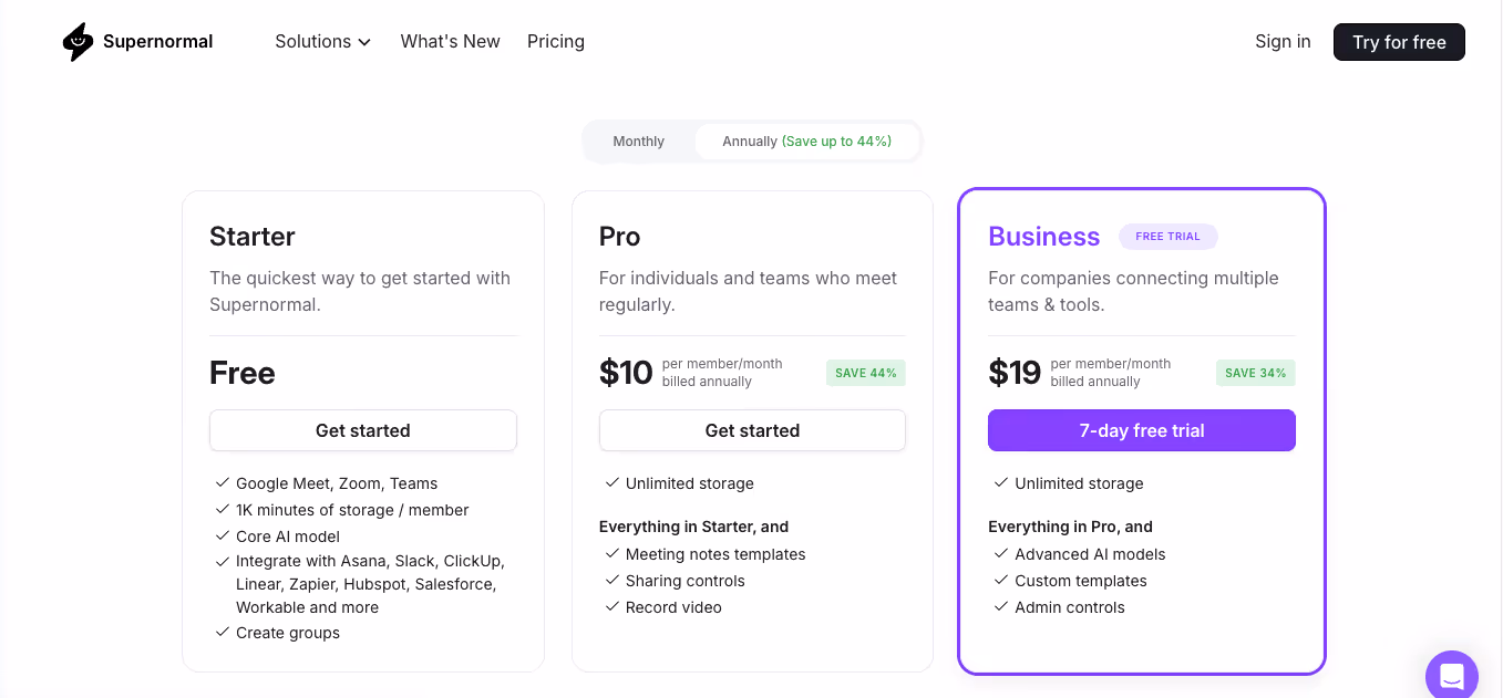 Los costos de la IA supernormal comienzan en 10 dólares por usuario al mes. También ofrece un plan gratuito con créditos limitados, y los planes de nivel superior ofrecen funciones adicionales, como resúmenes semanales y funciones avanzadas de asistente de inteligencia artificial.