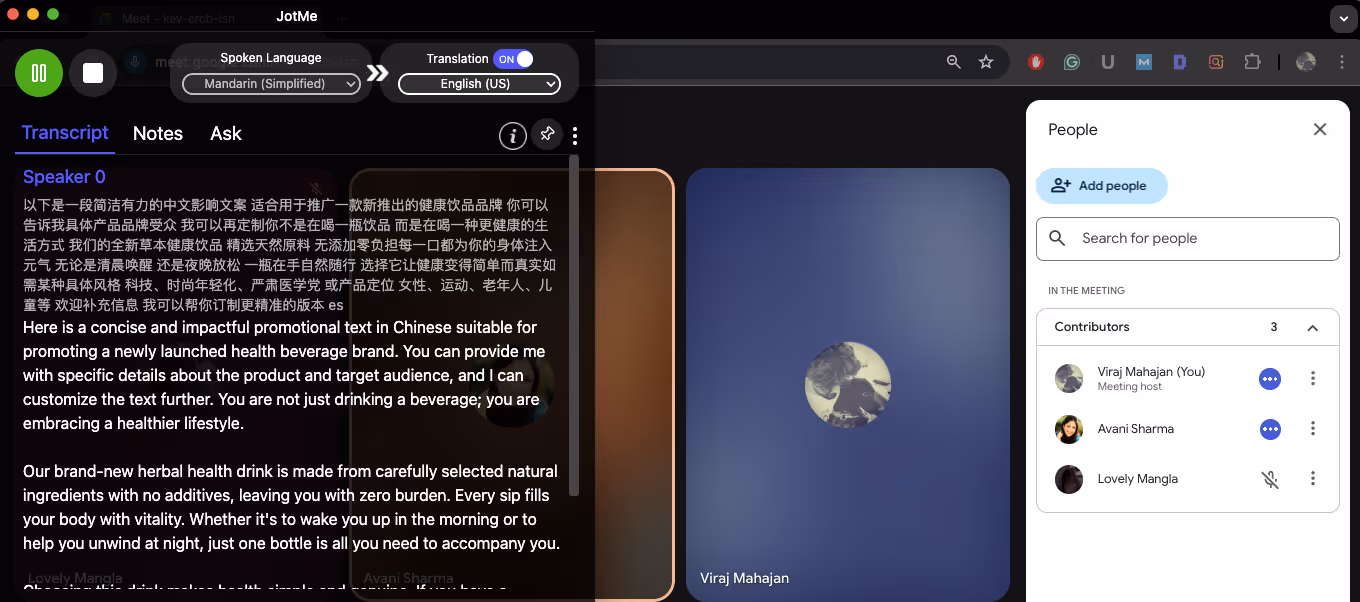 Una vez que JotMe esté instalado en su sistema, solo tiene que iniciarlo mientras está en la reunión, y el sistema impulsado por IA comenzará a traducir la reunión en tiempo real a su idioma preferido.