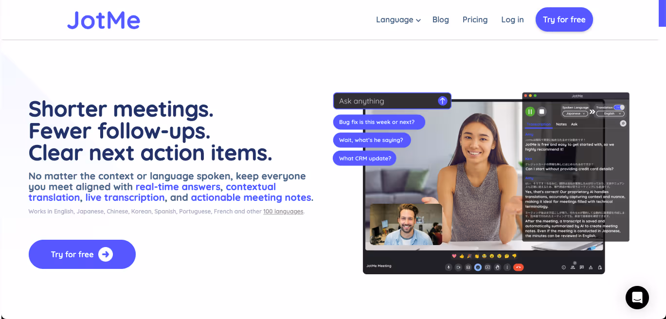 La mayoría de los «traductores de IA» sienten que están procesando texto a través del Traductor de Google en piloto automático. Pero JotMe toma un camino diferente. Utiliza el contexto de todas las reuniones para gestionarlas en tiempo real Traducción mediante IA en Google Meet, Zoom y Microsoft Teams en más de 45 idiomas.