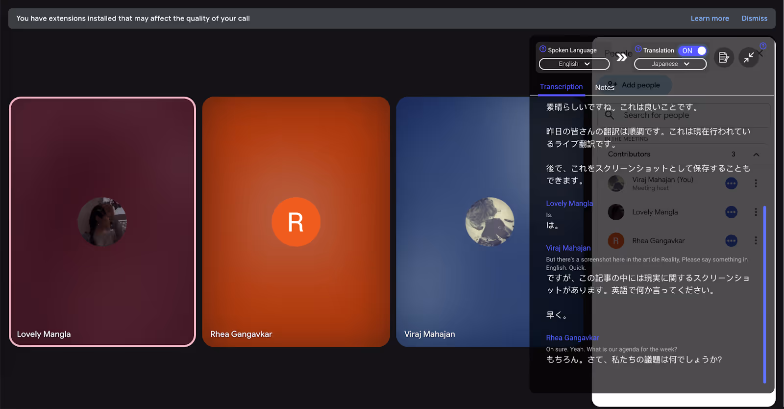 No requiere ningún permiso de reunión, integración de calendario ni permiso aceptado por parte del anfitrión. Una vez activado, simplemente escucha, entiende lo que dicen los diferentes oradores y ofrece una traducción en vivo que realmente tiene sentido. Para probarlo, utilizamos el traducción en vivo durante una reunión bilingüe que tuvo lugar en inglés y japonés. La traducción en tiempo real fue sorprendentemente natural.