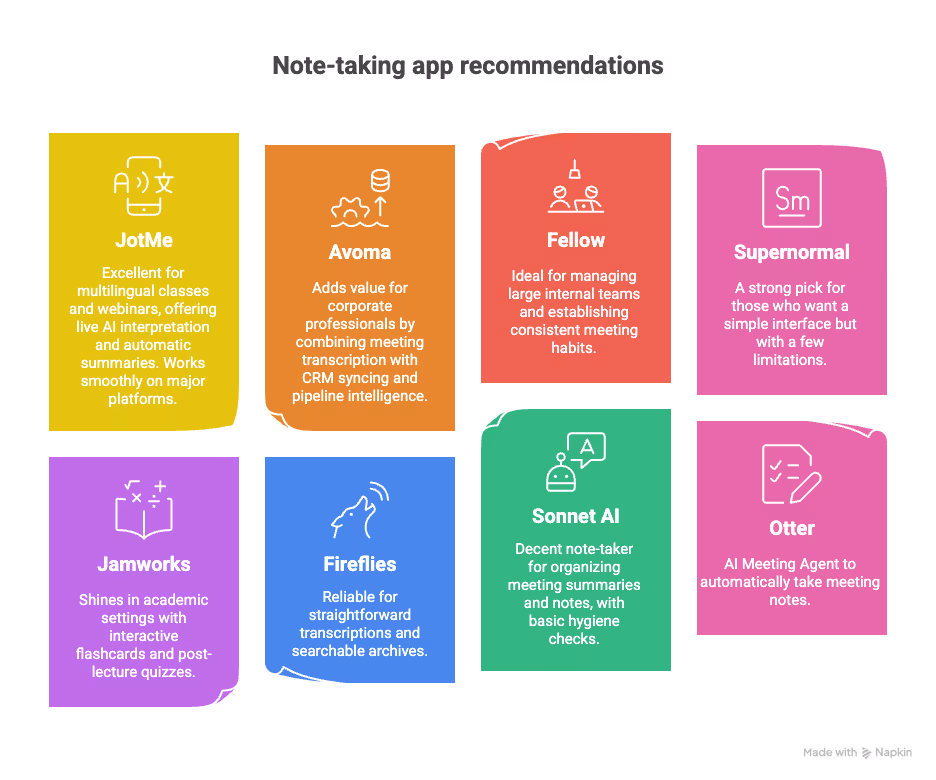 Los mejores tomadores de notas con IA son JotMe y Fireflies.ai. JotMe es ideal para los usuarios que necesitan Resumen de la reunión de IA, traducción en tiempo real y reconocimiento de oradores. Fireflies.ai es mejor para los equipos que buscan transcripciones con capacidad de búsqueda, integración de CRM y flujos de trabajo de comandos de voz.