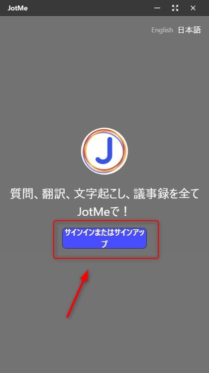 JotMe Maxを立ち上げると、初期の設定では英語になっているため、右上の日本語をクリックします。