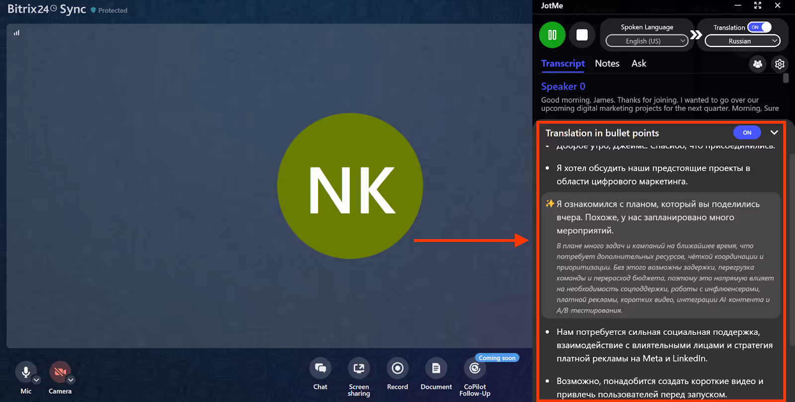 チームでビデオ通話または音声通話を開始したら、横にあるJotMeを開いて、一語一語会話をキャプチャし、希望する言語に翻訳します。Bitrix24のリアルタイム通話翻訳をオンラインで行うためのステップバイステップガイドは次のとおりです。