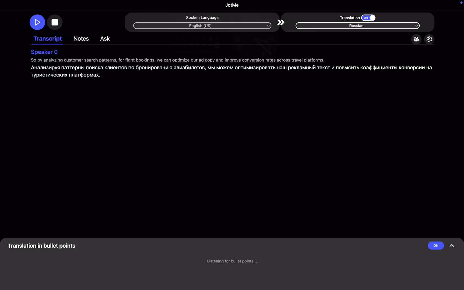 意味を理解せずに言葉を入れ替える基本的な翻訳者とは異なり、JotMeは会話のトーン、流れ、業界固有の用語を分析して自然な翻訳を行います。 ライブ翻訳。Bitrix24の通話中に誰かが誤って「フライト」ではなく「ファイト」と言った場合、JotMeはコンテキストをキャッチして自動的に修正し、「航空会社」と翻訳します。つまり、意味をなさない厄介な文字通りの翻訳を解読しようとしても、迷うことはありません。