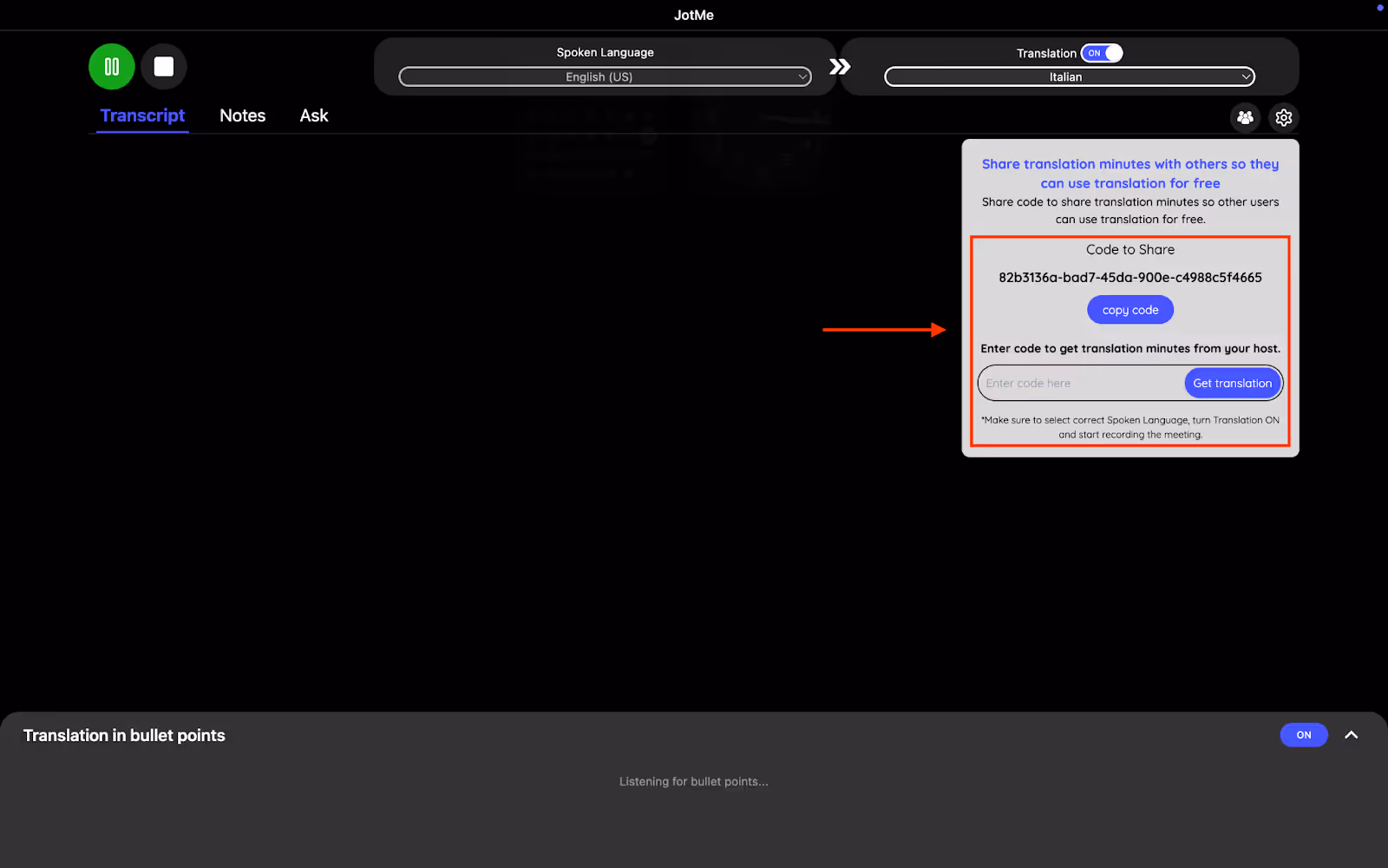 Bitrix24チームの全員がJotMeの恩恵を受けるために有料プランを必要とするわけではありません。録音と翻訳を開始すると、JotMe が独自のシェアコードを生成します。このコードを持っている人なら誰でも、リアルタイムの翻訳、議事録、議事録、要約に完全無料でアクセスできます。これにより、コラボレーションが簡単になり、購読状況に関係なく全員が足並みを揃えることができます。