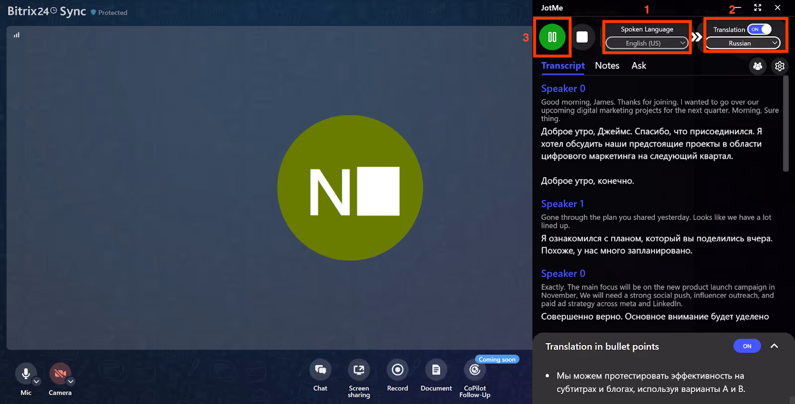 Bitrix24は現在、リアルタイムの通話翻訳をサポートしておらず、オンライン会議用のZoomとの統合はプレミアムユーザーのみが利用できます。そのため、Bitrix24の会議をオンラインでリアルタイムに翻訳するには、JotMeが最も信頼できるソリューションとなります。JotMe はボットへの参加やカレンダーの統合を必要としません。Bitrix24 通話を開始し、JotMe を横から開き、音声言語と翻訳言語を選択し、スタートボタンをクリックすると、コンテキスト付きのリアルタイム翻訳が表示されます。