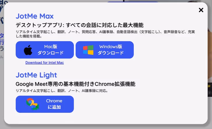 2.使用したいソフトをダウンロードします。筆者は、Windows版のデスクトップアプリ「JotMe Max」をダウンロードしました。Mac版をご利用の方は、こちらに手順が記載されています(インテルでのMacの場合はこちら)。クリックするとMac版が自動的にダウンロードされますのでご注意ください。