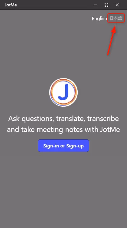 5.JotMe Maxを立ち上げると、初期の設定では英語になっているため、右上の日本語をクリックします。