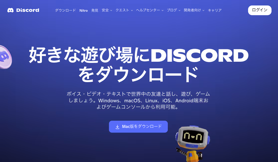 このステップは翻訳を行ううえで欠かせません。Discordのブラウザ版ではシステム音声を取得できないため、まずはデスクトップアプリをインストールする必要があります。画面の「ダウンロード」ボタンから、使用しているOS(WindowsまたはmacOS)に対応した公式アプリをダウンロードし、インストールを完了させましょう。なお、アカウントをまだ持っていない場合は、「ブラウザでDiscordを開く」をクリックして、ブラウザ上で新規登録することもできます。