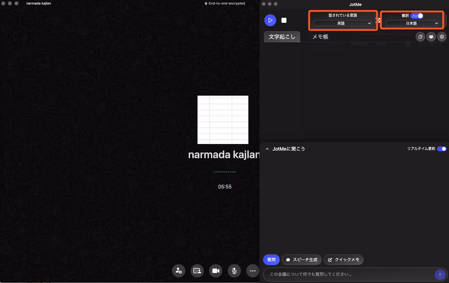 WhatsApp デスクトップと JotMe の両方を起動します。画面にJotMe ウィンドウが表示されたら、通話を始める前に言語設定を行いましょう。「翻訳」スイッチをオンに切り替え、ドロップダウンメニューから「話されている言葉」(相手が話す言語)と「翻訳」(自分が読みたい言語)を選択します。