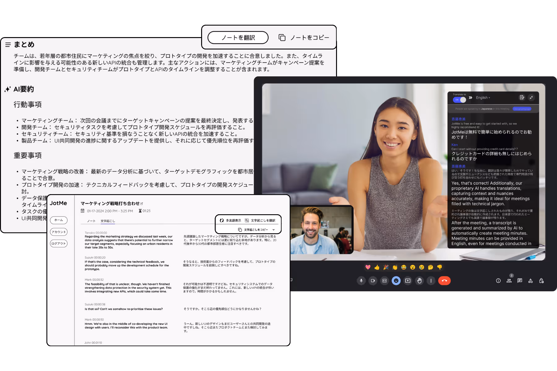 JotMeは、Google Meetでの議事録だけでなく、会議中でのリアルタイム翻訳などグローバールな仕事環境で活躍できます。翻訳や文字起こしを自動化して、重要な意思決定や次のアクション事項により多くの時間を割けるため、業務効率の向上に直結します。JotMeの多言語AI機能で、日々の業務をもっとスムーズに進めましょう!