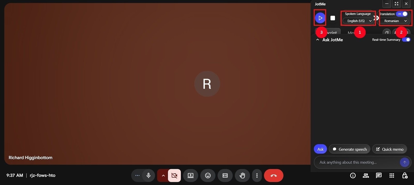 JotMe를 설치한 후 줌, 마이크로소프트 팀즈 또는 구글 미트와 같은 실행 도구를 사용하여 회의를 시작하거나 참여하세요.도구를 열고 새 회의를 시작하고 참가자를 초대하세요.그런 다음 장치에서 JotMe를 실행하면 대화를 시작하자마자 번역이 시작됩니다.