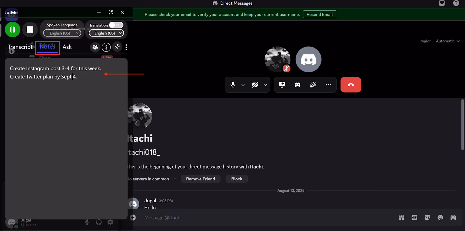게이머 외에도 개인용이든 전문가이든 누구나 Discord에서 전화를 걸고 전화를 걸 수 있습니다.후자의 경우 JotMe의 AI 회의 메모 기능을 이용할 수 있습니다.“메모” 섹션에서 통화 중에 실시간 메모를 작성할 수 있으며 JotMe는 하이라이트를 기반으로 회의 후 메모 및 요약을 생성합니다.