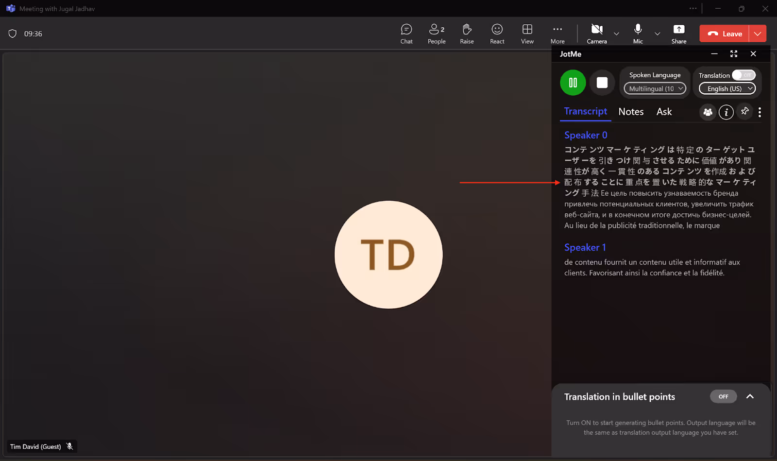 No canto superior direito da janela do JotMe, desative o botão “Tradução” se estiver ativado. Em seguida, defina o “Idioma falado” no menu suspenso para o idioma que o outro participante está falando. Você receberá as legendas ao vivo nesse idioma.