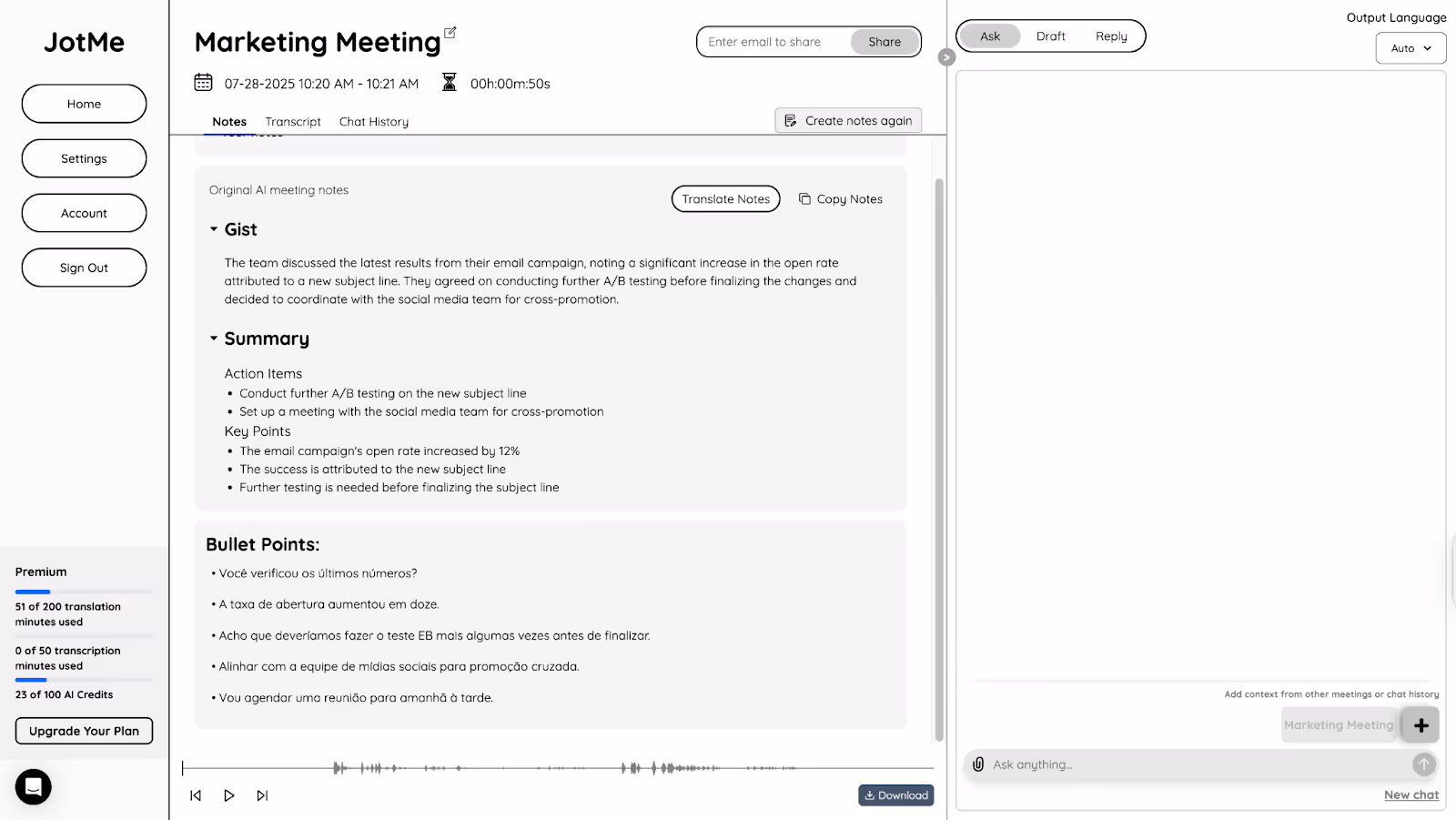 Se você ainda tiver dúvidas após sua reunião de equipes, você pode usar o recurso de bate-papo com inteligência artificial do JotMe para obter respostas para elas. Você pode perguntar o que foi discutido na reunião ou o que um determinado palestrante disse, e o JotMe lhe dará instantaneamente a resposta em seu idioma preferido. Além disso, o JotMe pode criar rascunhos para seu e-mail, documento, postagens em mídias sociais, etc., e respostas para quaisquer mensagens, comentários em mídias sociais, e-mails e muito mais.