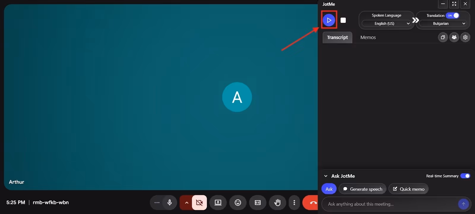 Начните совещание или присоединитесь к нему на предпочитаемой платформе (Google Meet, Zoom или Microsoft Teams), а затем откройте приложение JotMe. По умолчанию оно появится в правой части экрана. Окно можно настроить, перетащив его с любой стороны.