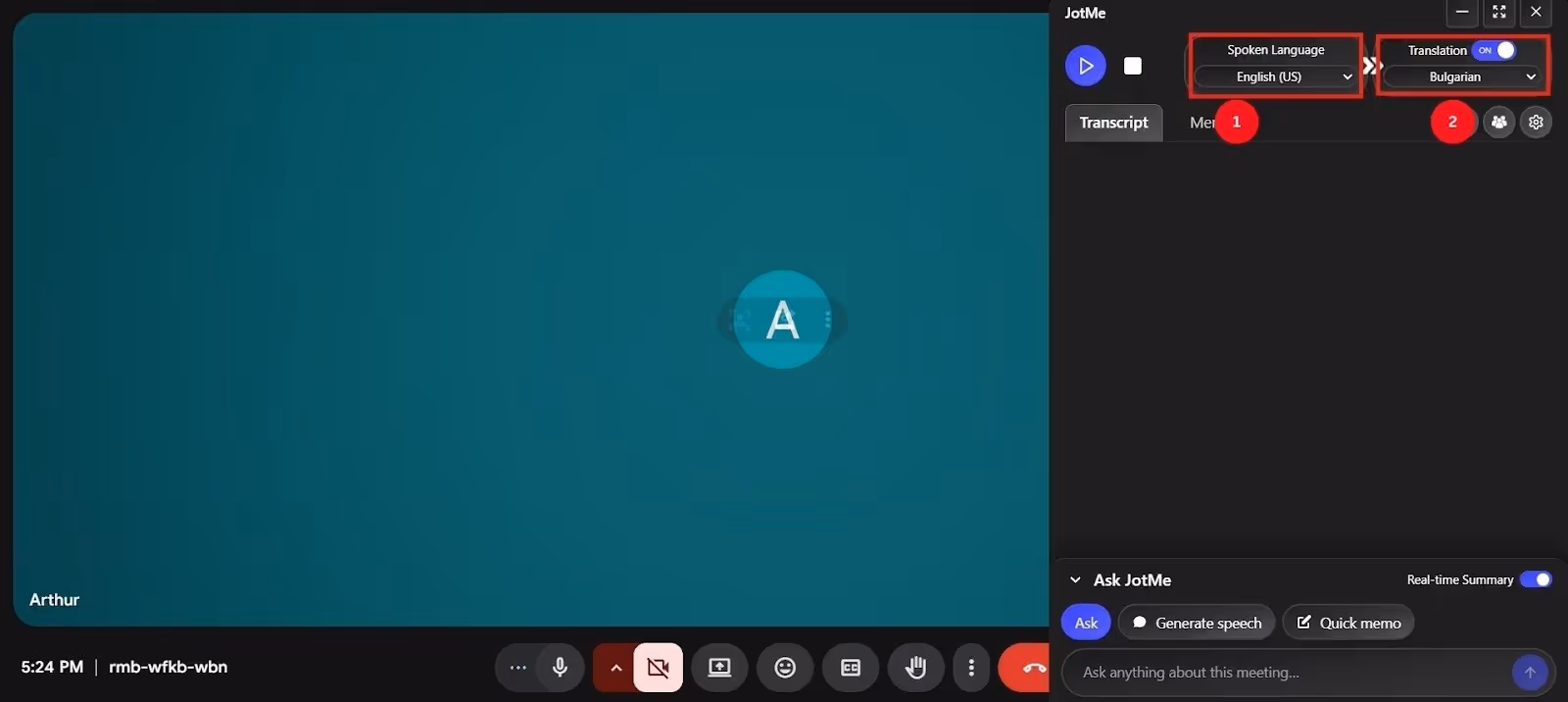 Людям-переводчикам часто трудно перевести английский язык на болгарский язык, особенно на деловых встречах с несколькими участниками. Между тем, JotMe является одним из лучший живой перевод приложения, обеспечивающие перевод в реальном времени без потери контекста. Кроме того, JotMe предлагает сводку в реальном времени, мгновенно отвечает на ваши вопросы и многое другое для оптимизации встреч. Вот несколько функций JotMe, которые могут вам помочь: