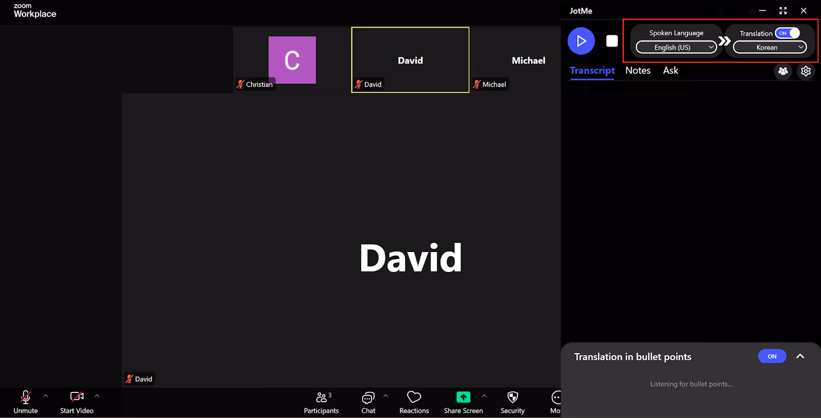 Trong số các công cụ khác nhau mà chúng tôi đã thử nghiệm, JotMe nổi bật là công cụ dịch thuật thời gian thực tiếng Anh sang tiếng Hàn tốt nhất bằng cách cung cấp bản dịch trực tiếp chính xác trong cuộc gọi Zoom của chúng tôi. JotMe đã lắng nghe những người nói tiếng Anh trong cuộc họp của chúng tôi và ngay lập tức cung cấp bản dịch trực tiếp theo ngữ cảnh cho các đồng nghiệp nói tiếng Hàn của chúng tôi.