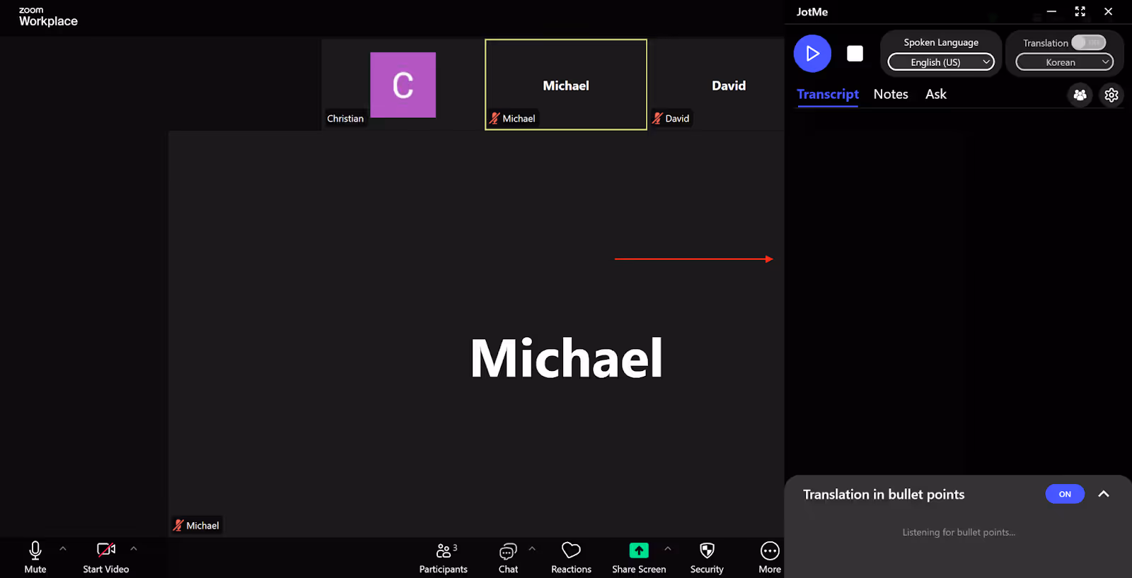 Bạn có thể nhận bản dịch trực tiếp từ tiếng Anh sang tiếng Hàn với JotMe bằng cách cài đặt JotMe trên thiết bị của mình và khởi chạy nó trong khi tham dự các cuộc họp hoặc bài giảng trực tuyến của bạn. JotMe là một trình thông dịch AI theo ngữ cảnh và tương tác cung cấp cho bạn ngay lập tức dịch thuật thời gian thực từ tiếng Anh sang tiếng Hàn trong các cuộc họp, bài giảng hoặc thảo luận dự án của bạn. Đây là cách bạn có thể sử dụng nó để dịch tiếng Anh sang tiếng Hàn trực tuyến.