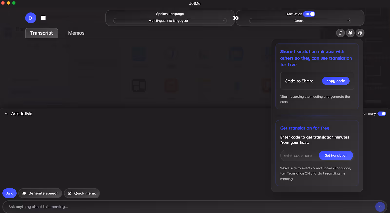 Không phải tất cả mọi người trong cuộc họp có thể có gói trả phí của JotMe. Tuy nhiên, JotMe cung cấp một mã duy nhất cho phép bất kỳ ai truy cập miễn phí vào các phút dịch. Bạn sẽ nhận được mã ngay khi bản dịch bắt đầu, bạn có thể chia sẻ mã này với những người tham gia.