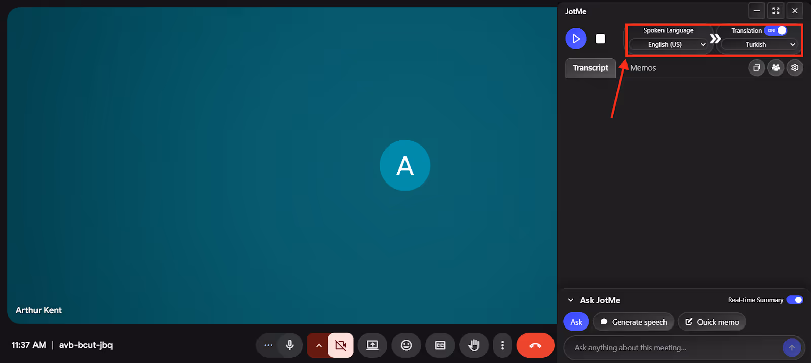 JotMe là một công cụ dịch thuật tiếng Anh sang tiếng Thổ Nhĩ Kỳ đáng tin cậy cung cấp bản dịch tức thì, chính xác cho các cuộc hội thoại. Quá trình này rất đơn giản: bạn thiết lập một cuộc họp ảo, chọn ngôn ngữ và nhấn “Phát” để nhận bản dịch theo thời gian thực. Dưới đây là các bước chi tiết: