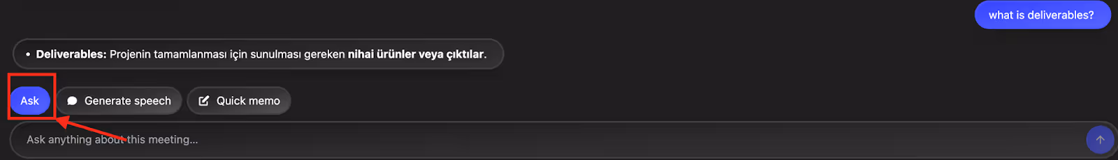 Trong cuộc họp, nếu bạn không hiểu một thuật ngữ xuất hiện, hãy thử tính năng AI Ask của JotMe. Nhấp vào tính năng “AI Ask” ở cuối cửa sổ, đặt câu hỏi và nhấn Enter. JotMe sẽ cung cấp câu trả lời chi tiết, tức thì cho bất kỳ câu hỏi nào của bạn.