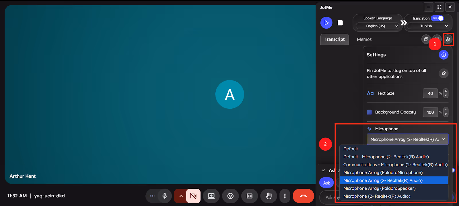 Bước 2: Khởi chạy JotMe, tham gia cuộc họp và chuyển đổi tùy chọn dịch trực tiếp.